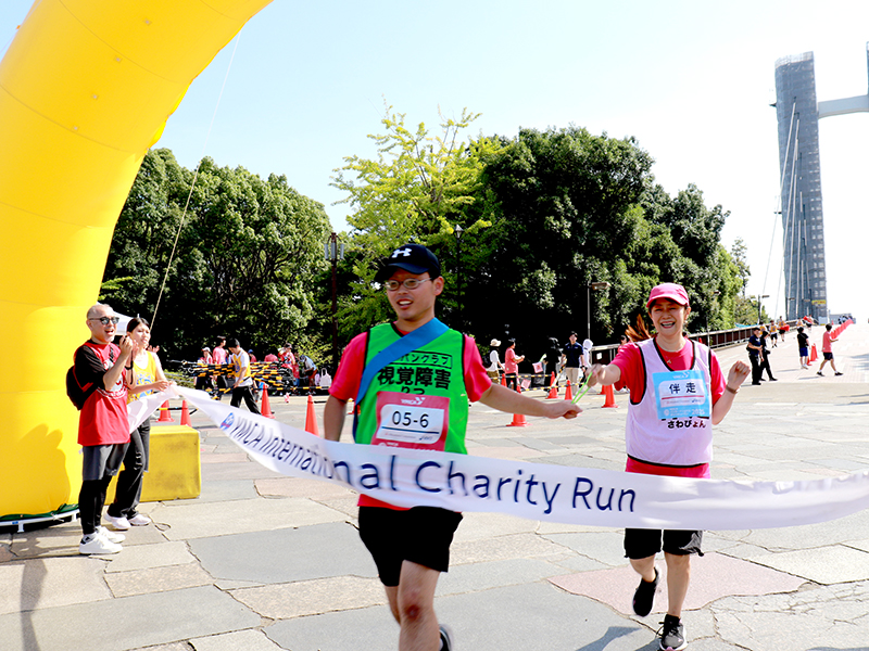 今年は台風の影響で風が強くエアアーチを撤去してスタートしましたが、心配された雨は降らず、時折日差しもさしこむ中、会場は色とりどりのランナーで賑わいました。また今年は障がいのある方の参加も多く約40人が伴走者とともに力走しました。
